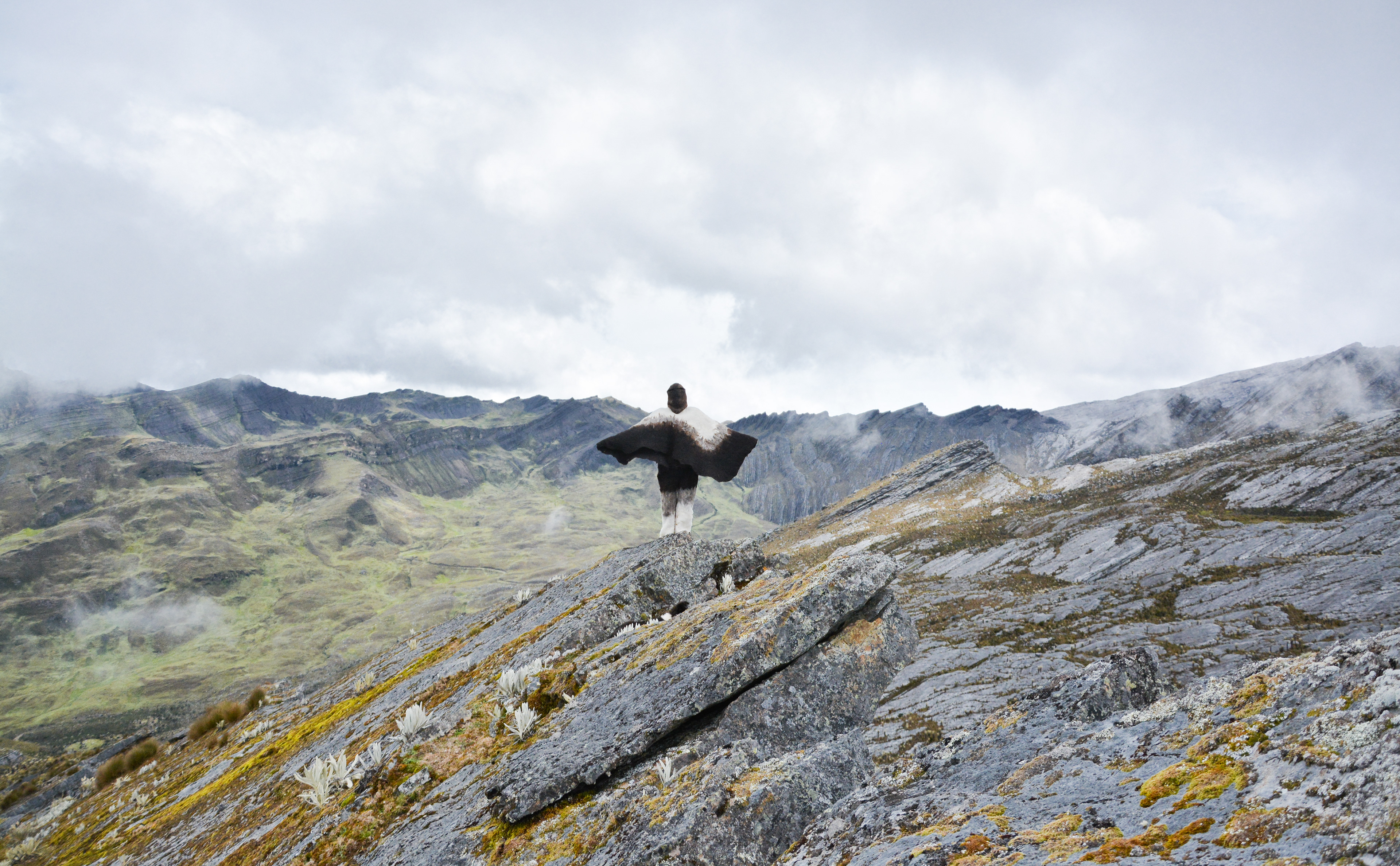 Este proyecto nace del encuentro entre la lana, el viento, la roca y la presencia del cóndor en la Sierra Nevada del Güicán, Boyacá. Inspiradas en esta geografía y en la presencia de estas aves, Ruanas Hermanas Ritak'uwa son más que piezas textiles: son cuerpos de montaña, extensiones de un paisaje en transformación, una manera de experimentar el vínculo entre el ser humano y su entorno. Blancas y negras, como las plumas del cóndor andino, estas ruanas fueron creadas mediante fieltro húmedo, un proceso en el que la lana cruda, el agua y la fricción se combinan para generar una fibra compacta y resistente. No están tejidas, sino formadas por la presión del cuerpo sobre la materia, evocando el gesto primitivo de pisar la lana, un acto que conecta con antiguas prácticas de transformación textil en el mundo rural.